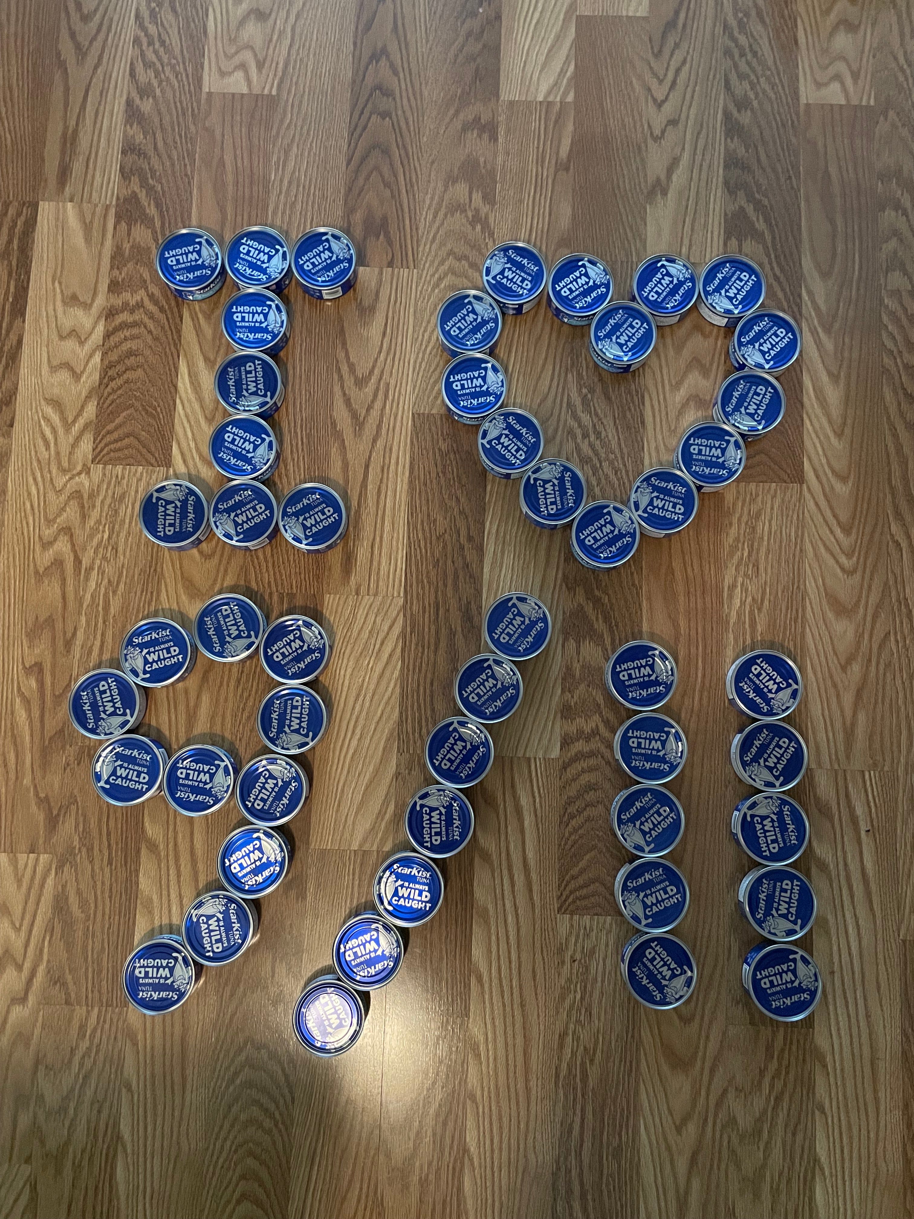 51 tuna cans spelling out "I <3 9/11"